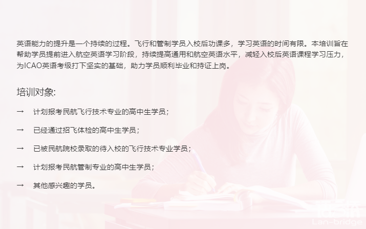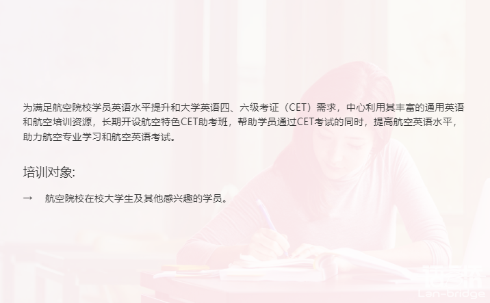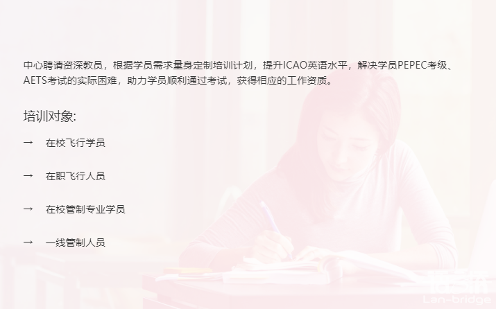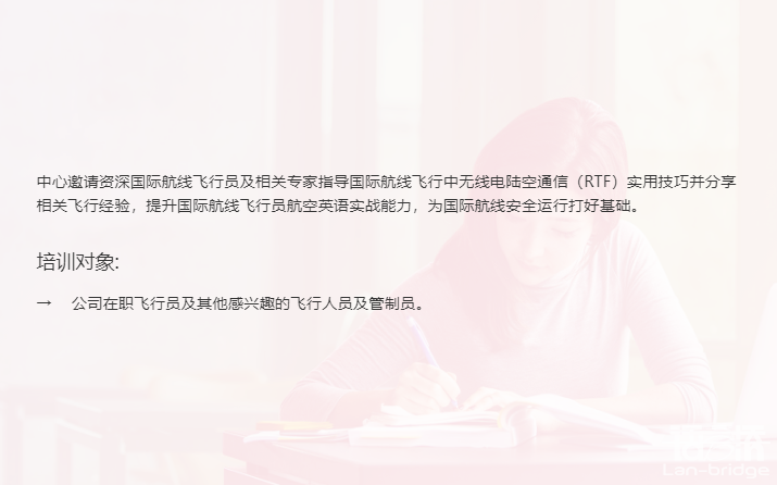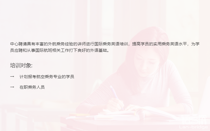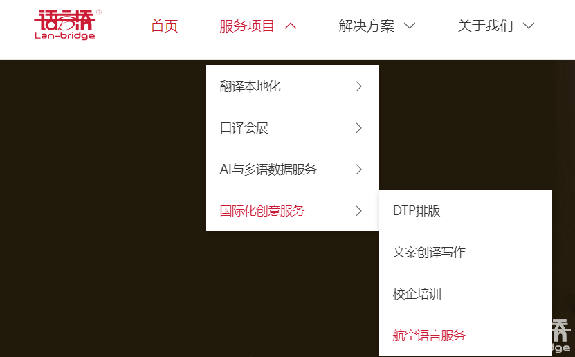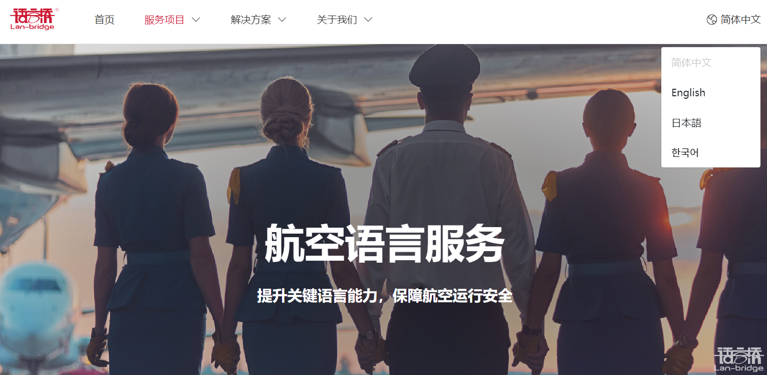 進(jìn)入語言橋官網(wǎng)(www.lan-bridge.com)后,點(diǎn)擊網(wǎng)頁頂部菜單欄【服務(wù)項(xiàng)目-國際化創(chuàng)意服務(wù)-航空語言服務(wù)】,即可訪問頁面進(jìn)行瀏覽。